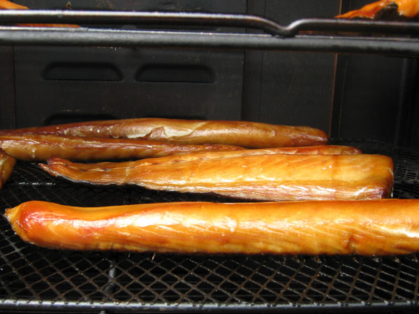 Most smoked products are not eaten immediately but later. They must look presentable and appealing to a customer. Smoked fish should have a glossy appearance; it should shine. This shine, known as “pellicle” is due to the reaction between salt and fish proteins. Salt “swells” the proteins, and they unwind and release some of their contents. Some of those proteins dissolve in salt and become a sticky substance (exudate) that settles on the surface of the fish. After drying, this sticky substance becomes a shiny, clear protein coat known as “pellicle” that may be compared to shoe polish. After smoking, this clear pellicle becomes a shiny lacquer on the surface of the fish. Given that smoked fish acquires a golden color, the pellicle looks golden, too. It can be compared to a shiny wooden parquet floor that was covered with clear varnish. The longer the brined fish are allowed to hang, within reason, the better the gloss that develops. The best gloss develops with 70-80 degree brine. To develop a pellicle, one hour is probably the minimum, but for a large fish, 12 hours or more is not uncommon. Previously frozen fish produces very little pellicle since frozen water crystals rupture the flesh of the fish, permitting some proteins to leak away. If dry salt is applied with pepper and other spices, this gloss will be hardly present as the spices will cloud the surface.