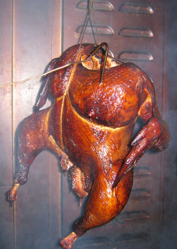 When the birds are dry or tacky to the touch, they should be placed in a pre-heated smoker. Keep the damper wide open to allow moisture to escape. Once the birds feel dry, leave the damper in ¼ open position and smoke at 130° F (54° C) for about five hours. Then continue smoking slowly raising the temperature to 165-170° F (74-77° C) and hold until the inside temperature in the thickest part of the breast is 160° F (71° C). You could insert a thermometer close to the ball and socket joint of the thigh as this is also the last place the meat becomes fully cooked. If the thermometer is not available, you can check the turkey by twisting the leg slightly. If it moves easily, the cooking is done. Small birds like cornish game hens or small chickens will need shorter smoking and cooking times.